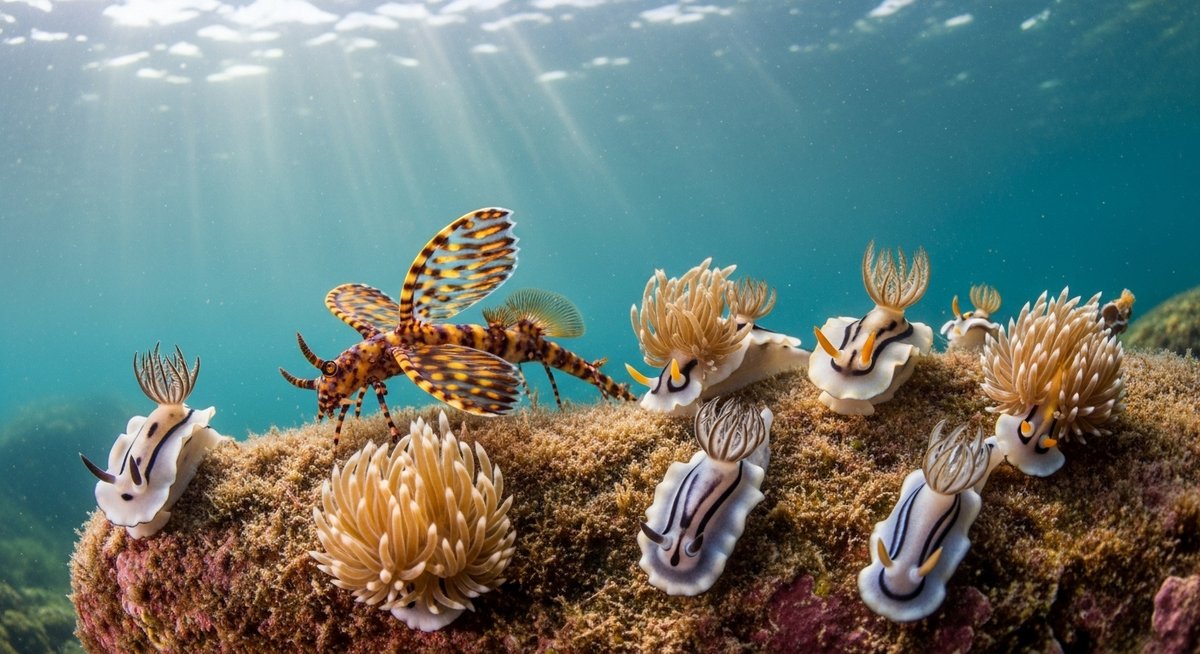 ウミウシは多様な系統がまとめられて使われる呼び名で、カラフルな種から地味な種まで含まれます。中にはサンゴや海綿を食べるもの、他の無脊椎動物を食べて毒を取り込むものなど、食性も多彩です。