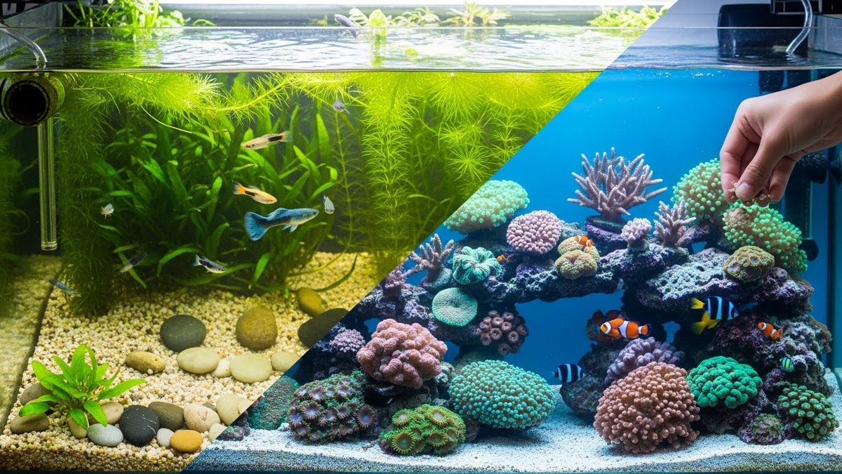 淡水水槽はろ過装置とヒーター、照明が基本で始めやすいです。水換えの頻度や植物の導入でバランスを保ちます。海水水槽は比重計やプロテインスキマー、ライブロックなど専用機器が増え、設置コストが高くなります。