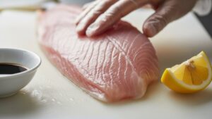 刺身風にする場合は新鮮なものを薄くスライスするのが肝心です。斜めに切ると断面が広くなり、食感と見た目が良くなります。切ったら氷を敷いた皿に並べ、彩りに大葉やレモンを添えると見栄えが良くなります。